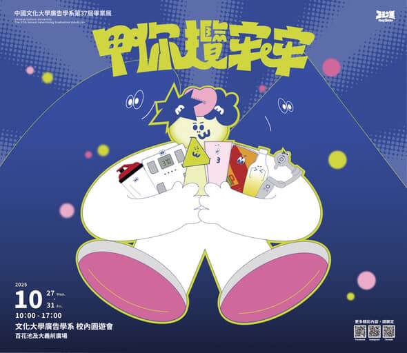 (此為廣告學系公關新聞稿) 中國文化大學廣告系第37屆畢業展 校內園遊會「甲你攬牢牢」新聞稿 創意滿滿、熱力全開!以「甲你攬牢牢」為主題的文化大學廣告系校內園遊會,將於10月27日至31日在百花池畔及大義前廣場盛大登場,為第37屆廣告系畢業展熱鬧揭開序幕。活動以「快 ...
