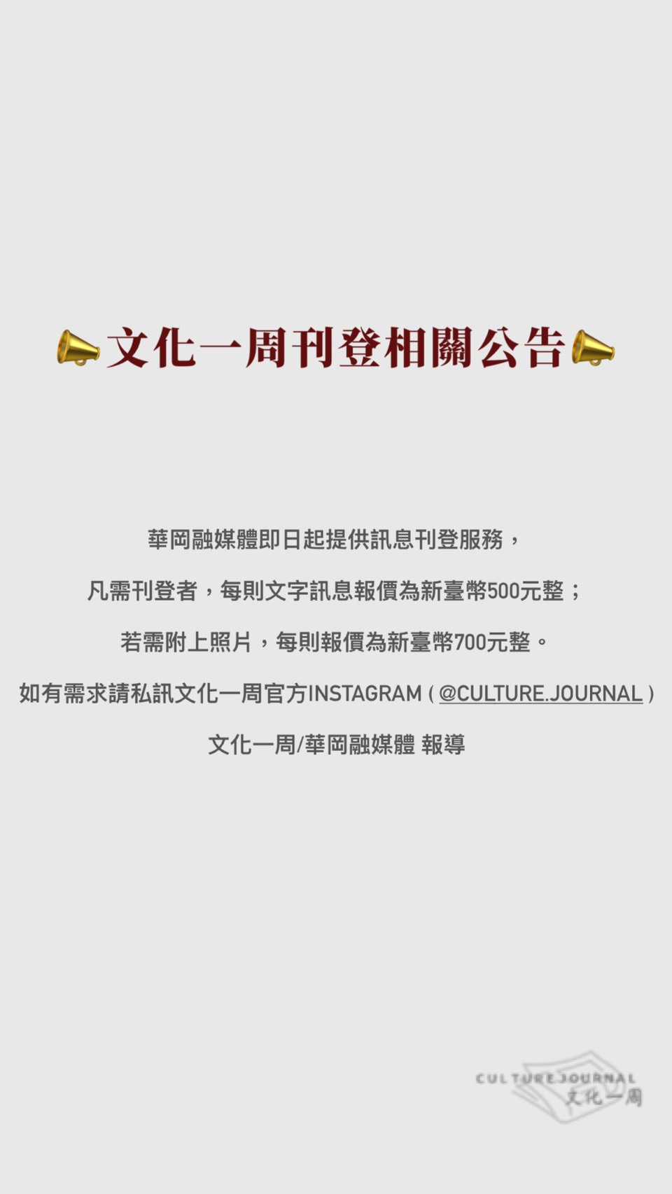 華岡融媒體即日起提供訊息刊登服務,凡需刊登者,每則文字訊息報價為新臺幣500元整;若需附上照片,每則報價為新臺幣700元整。 如有需求請私訊文化一周官方Instagram (@culture.journal)文化一周/華岡融媒體 報導 ...